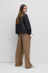 The Quilted jacket with a zip closure and a button placket. The jacket features front patch pockets and includes adjustable cords at the wrist and jacket hem.