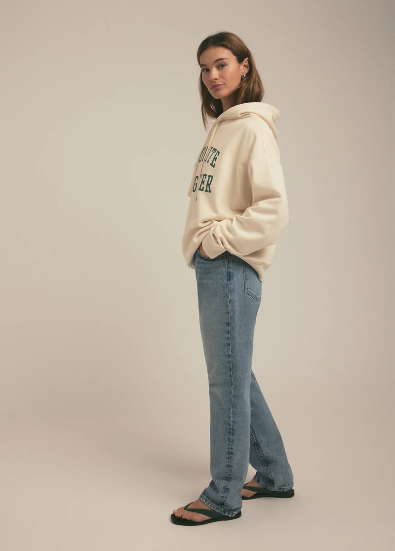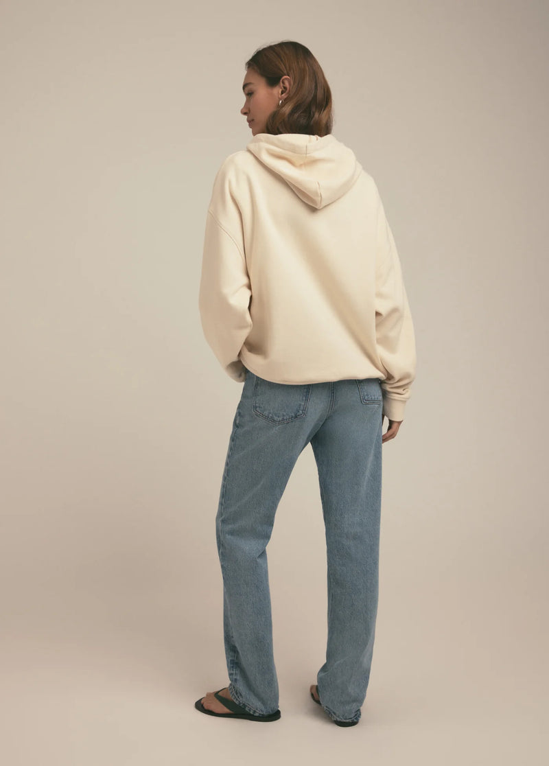 So there's no confusion. Our oversized hoodie is made from a cotton blend (so it shrinks to fit just right). With the drop shoulder and relaxed fit, this plush classic is sure to be your weekend favorite.