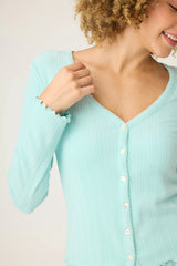 Fitted and sweet with a vintage feel, this light mint cardigan is crafted from double-brushed pointelle fabric with subtle ribbed texture. It features a delicate V neckline, scalloped trim along the edges, and dainty lettuce-edge sleeves—a dreamy sleepwear essential for layering or lounging solo, all year long.