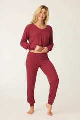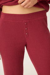 Sometimes the simplest pieces are the ones you reach for most. These ribbed lounge pants are crafted from soft cotton-blend jersey with a comfy elastic waistband, faux button fly, and soft cuffed hems. The deep berry hue adds a sense of richness and warmth—perfect for everything from laid-back mornings to winding down at night.