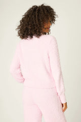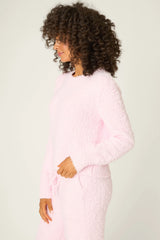 Snuggle into the holiday season with this pink bouclé long sleeve top, playful and plush in equal measure. Finished with a crew neckline and ribbed trim, it’s a holiday-ready piece that works perfectly with bouclé shorts or pants.