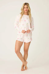 A toast to bedtime, this long-sleeve PJ top features an allover cocktail print on a baby-pink and white striped base, crafted from double-brushed pointelle for a supremely soft feel. Delicate scalloped trim at the neckline and cuffs adds a sweet touch to this cozy crewneck silhouette.