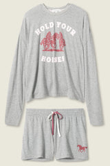 Easygoing comfort with a playful nod to the West. This heather grey short pajama set features a vintage-style horse graphic and “hold your horses” lettering, paired with relaxed drawstring shorts for warm-weather lounging.