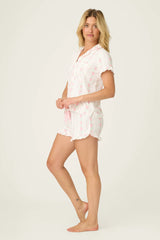 Romantic, soft, and made for restful moments at home, this three-piece pajama set brings a timeless, feminine feel to downtime in soft ivory with a delicate rose floral print. Crafted from cozy, lightweight double brushed pointelle, it features a short-sleeve button-front top with a notched collar, matching pajama shorts with ruffled hems and an elastic waistband, plus a coordinating eye mask for a sweet finishing touch.