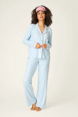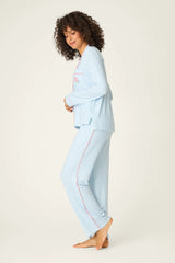 Saddle up for sweet dreams. This three-piece pajama lounge set blends classic blue stripes with charming floral embroidery, finished with playful “darling” embroidery on the cuff and matching sleep mask. Red piping down the pant legs adds a hint of rodeo-ready polish, for slow mornings, lazy lounging, and kicking your boots off early.