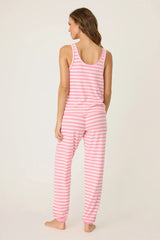 Sweet, striped, and ready to chill. This lounge top is crafted from soft peachy jersey in bold sorbet shades of pink and yellow, featuring a relaxed scoop-neck tank. A tiny floral embroidery blooms beside the neckline. The look is finished with a scoop back —perfect for slow coffee mornings, weekend errands, or simply soaking up the sweetness of staying in.