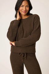 Your cozy go-to in the chilliest months—this long-sleeve top is crafted from plush chenille waffle in a rich chocolate brown hue. Designed with a relaxed fit, classic crew neckline, and banded cuffs, it locks in comfort while keeping things laid-back. The kind of staple you’ll reach for again and again, whether it’s slow mornings, fireside lounging, or curling up for an early night.