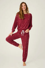 Double the cozy, double the charm. This fleece long-sleeve crewneck pairs so well with the matching banded lounge pants, both in burgundy with white horseshoe and star prints for a Western wink.