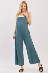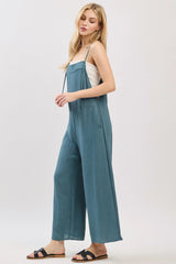 SPAGHETTI STRAP WIDE LEG JUMPSUIT WITH SIDE POCKETS.