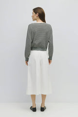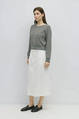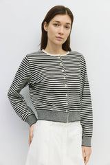The Gary Cardigan is a lightweight, long-sleeve stripe knit cardigan with a relaxed fit, button-down closure, and a subtle front bottom slit.