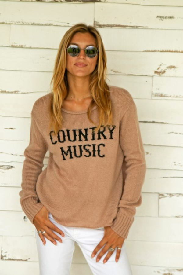 Tissue soft and super lightweight crew knit with a cozy yarn. "Country Music" is knit directly into the front adding a touch of fun to a classic fit top. This sweater wears like a tee and is perfect for transitioning seasons.