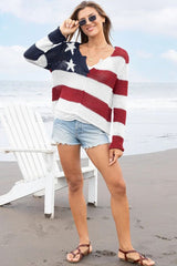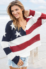 Knit using our soft, light, and breathable cotton blend yarn, this all-American top is designed for comfort and style all season long. The USA flag theme makes it an ideal choice for celebrating patriotic holidays. This super cropped sweater features a classic crewneck, rolled edge finish at neck and cuffs, and relaxed drop sleeves, creating an effortlessly stylish and laid-back look.