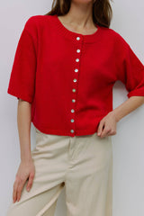 The Kara Cardigan is a lightweight, half-sleeve cardigan with a relaxed fit, ideal for layering over tops and tanks. Features a wide neck, shell button closure, and ribbed trim.