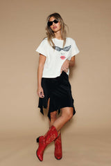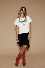 This classic, short sleeve tee will be your go-to staple this season and beyond.Introducing the "No Thanks Tee" by All Us, designed to add a playful twist to your closet. This short sleeve tee, crafted from 100% cotton, showcases a trendy raw hem and eye-catching black rhinestone details. Featuring a graphic that speaks volumes, this white tee offers attitude and style. Closure is a convenient pull on, and care is simple with machine wash instructions. Color: natural