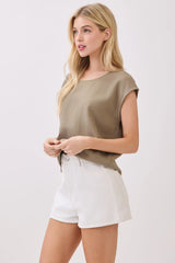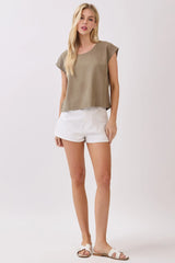 WOVEN BOXY TOP WITH EXTENDED SLEEVE AND ROUND NECK.