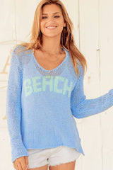 Introducing your new favorite everyday knit! This soft, lightweight, and breathable top is crafted with an open construction for an airy feel. The fit is wonderfully boxy and slightly cropped, with the word "BEACH" knit directly into the center front. The deep V-neckline is flattering and keeps you feeling cool. Made with our cotton blend yarn, this versatile top pairs perfectly with denim or can be worn over a bathing suit.