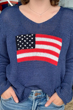 Knit using our soft, ropey, and breathable cotton blend yarn, this tunic-length V-neck has a flattering, relaxed fit. Featuring an American flag intarsia, knit directly into the center front. Details include a rounded hem with side slits, making this top super versatile - tuck it, knot it, belt it, or just let it be.