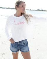 This cropped, long-sleeve knit is crafted from a soft cotton-blend yarn with a comfortable hand-feel that’s perfect for transitional weather. Front and center, “Love” is hand-embroidered in script, adding a special, personal touch you can feel in every stitch. A textured ribbed knit, relaxed dropped shoulders, and subtle side slits create an easy, flattering drape—effortless with high-rise denim, skirts, or layered over a dress.