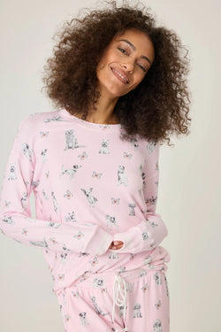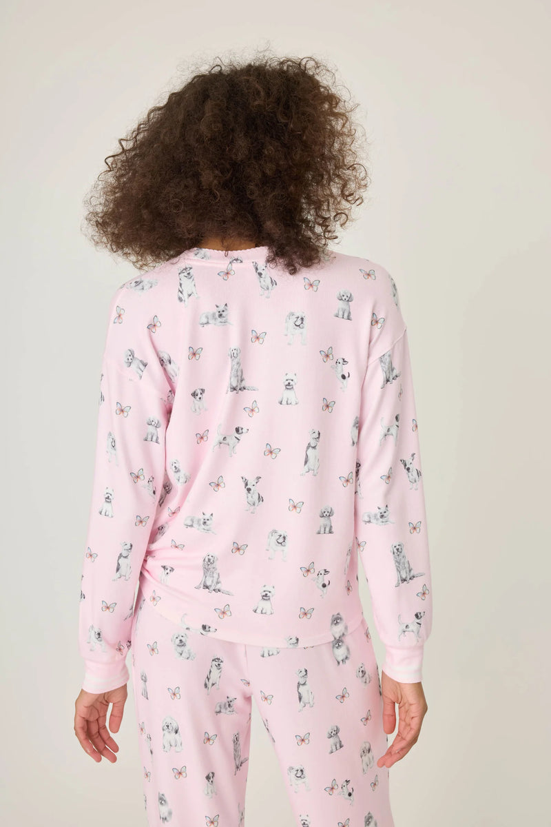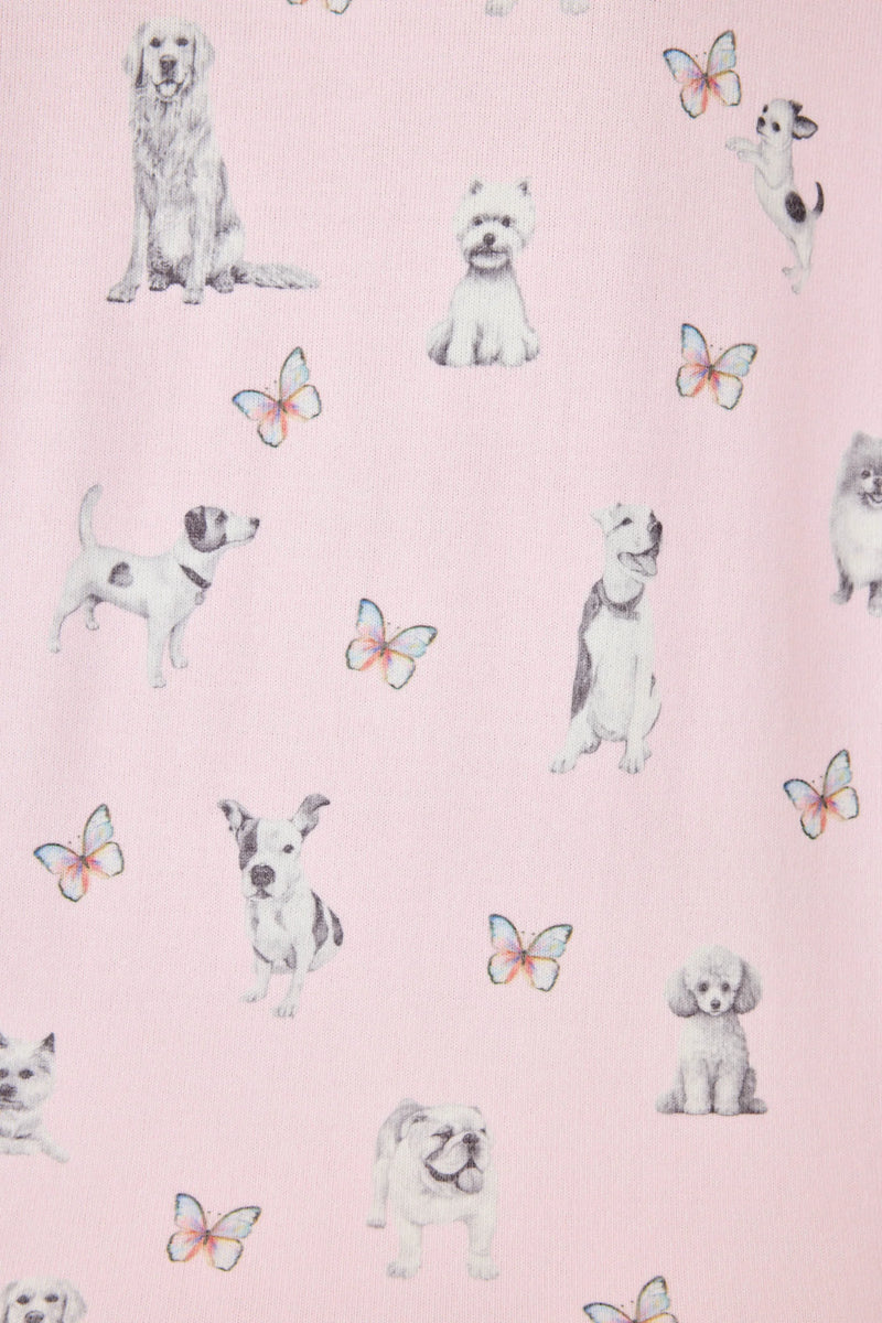 A little bit dreamy, a whole lot of cute. This long-sleeve top is crafted from our peachy-soft jersey with a relaxed fit that’s made for snuggling up. The pastel pink backdrop sets the stage for the sweetest print of playful pups and fluttering butterflies, channeling the heart-warming feels of a four-legged friend. Finished with subtle scallop embroidery at the neckline and sporty striped cuffs, it’s the perfect match for the coordinating shorts or pants.