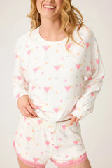 A toast to cute and comfy. This ivory long-sleeve lounge top is made from lightweight pointelle knit and printed with pink martinis and pastel flowers. Finished with a relaxed fit and classic crew neckline, it’s perfect with the matching shorts for lounging, sleeping, or coordinating with the bridal crew.