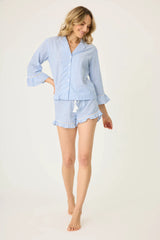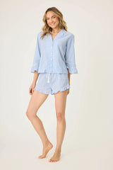 As dreamy as a field of wildflowers. This blue-and-white striped sleep short is pure whimsy. Fluttery shorts with a tasseled drawstring waist add just the right touch of charm. Light, airy, and made for slow mornings and sweet dreams.