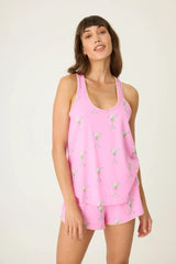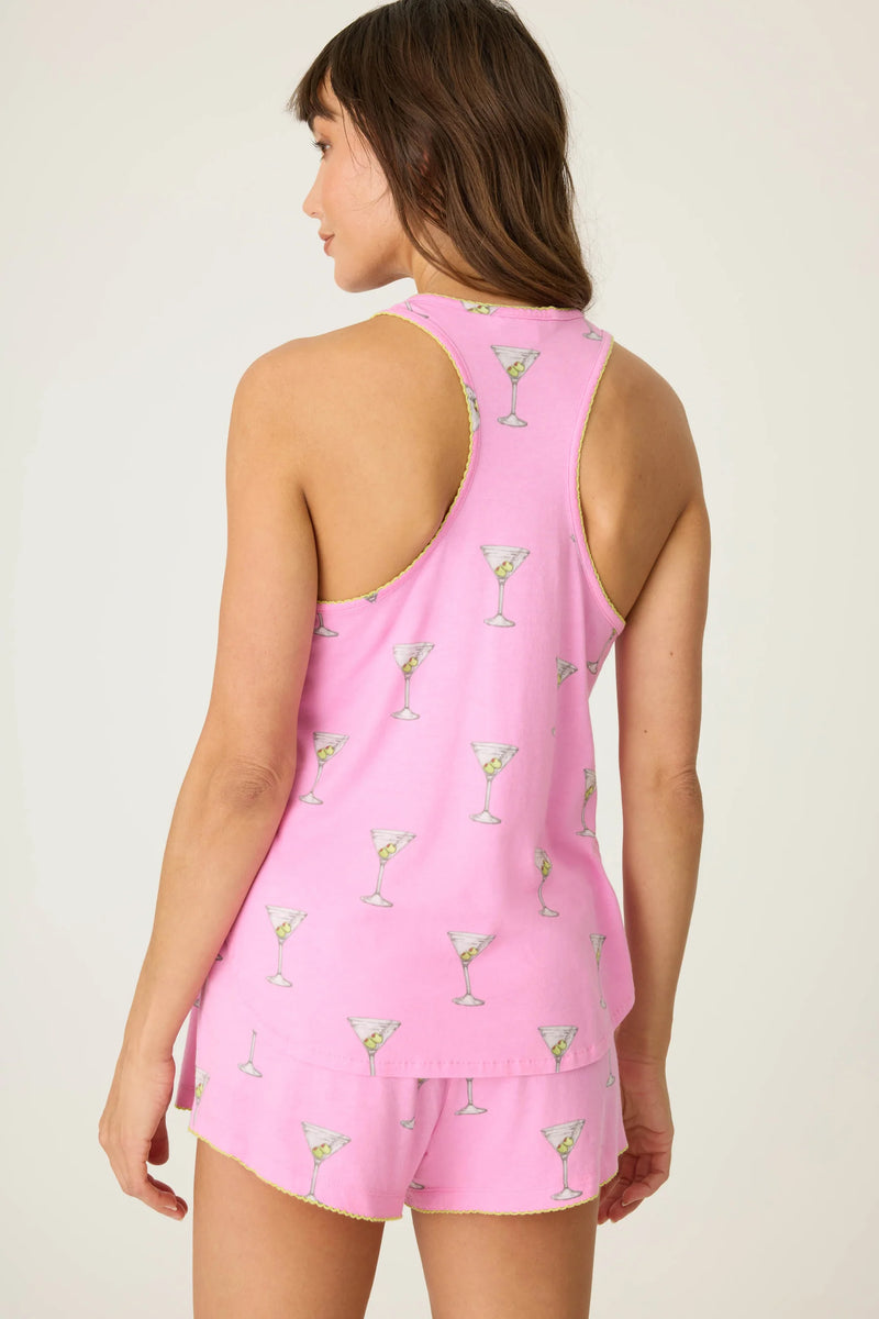 Cheers to cozy nights in! This playful martini-print sleep tank is the perfect way to toast to relaxation, crafted from a soft cotton-modal blend in bubblegum pink. It features a racerback design and a curved hem that’s just as fun as it is relaxed. The neckline is adorned with whimsical scalloped embroidery, adding a quirky touch to the classic silhouette. Pair it with the matching shorts or pants for a coordinated set that’s ready for a laid-back night in.