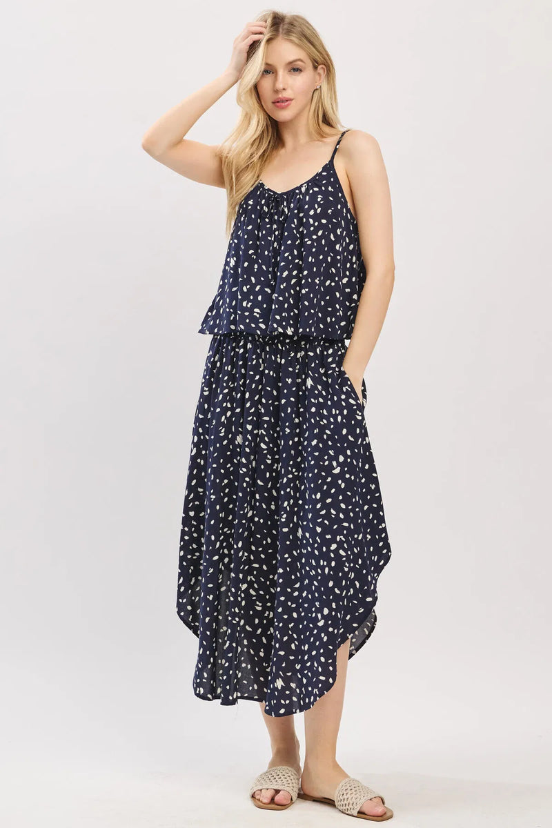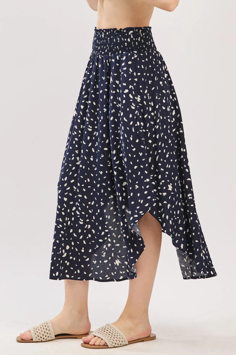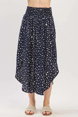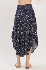 The Tina Skirt is a flowy Navy midi skirt with a smocked waistband. Its comfortable and effortless. Pairs best with the matching Tina Top.
